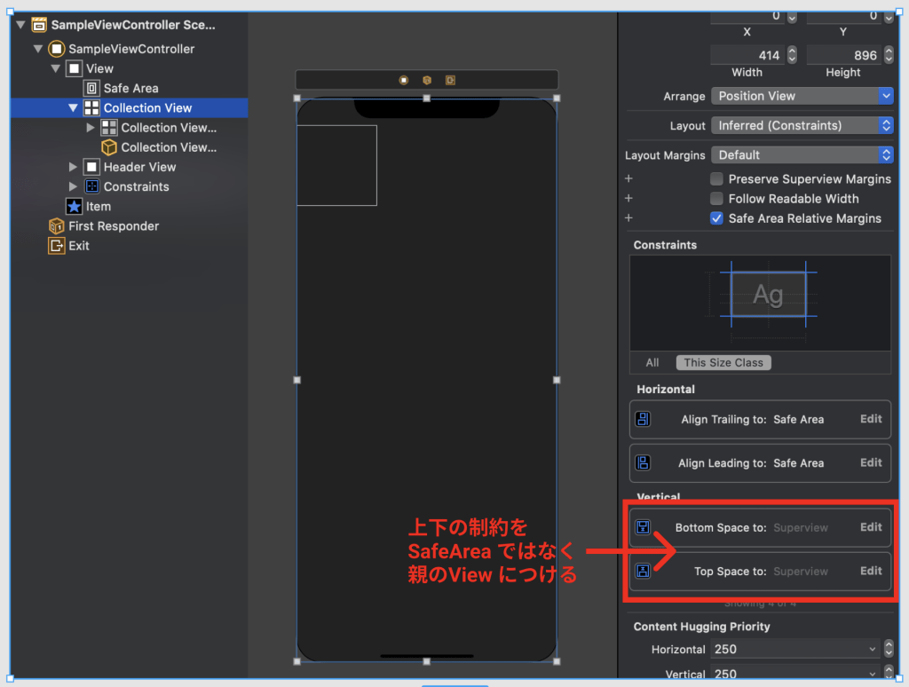 UICollectionView は上下左右いっぱいに制約をつけます。
