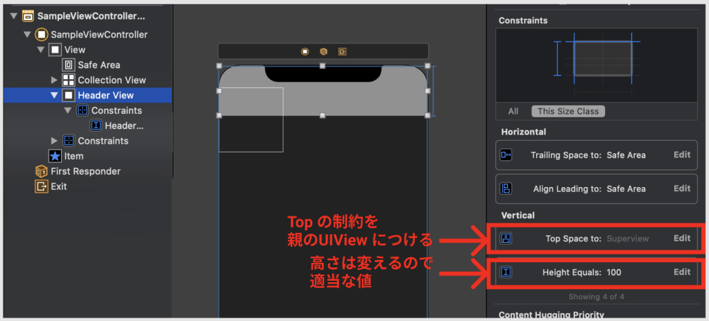 あとはヘッダービューの高さの制約をIBOutlet で繋ぎ、
