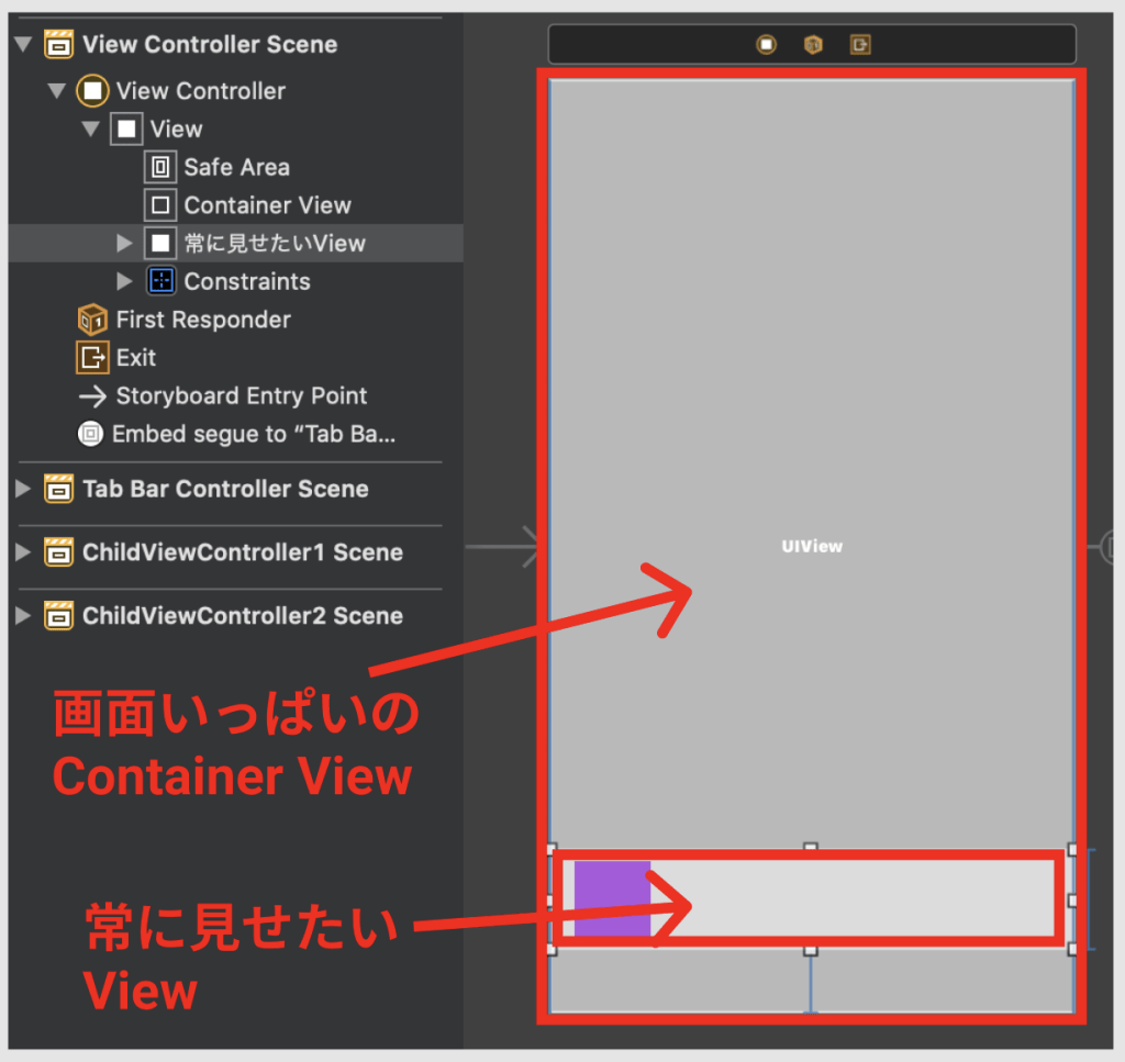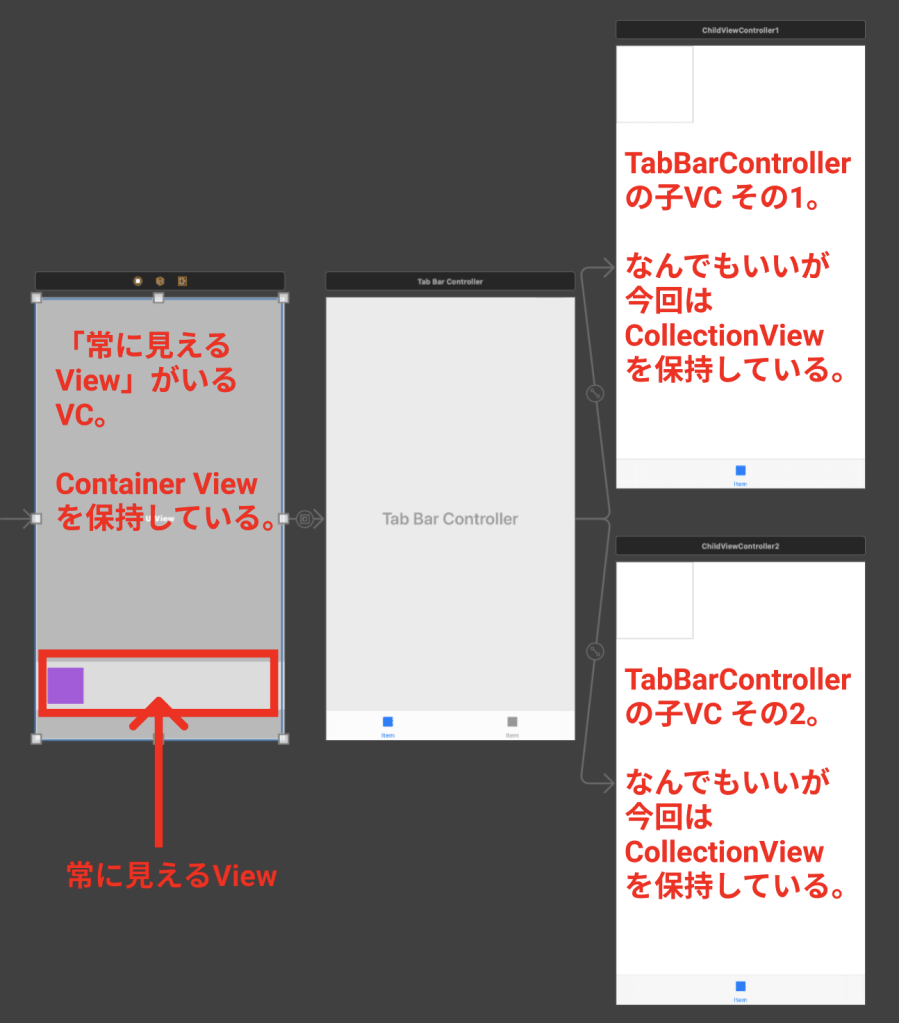 その際、CollectionView の上下の制約の付け方に注意です。 上下の制約を、SafeArea ではなく、親のView(= UIViewController のView) につけます。 図示するとこんな感じ。