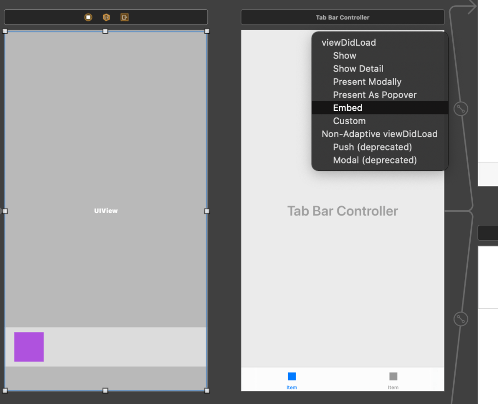 以下の画像のように、親のView の上に UIView を貼り付けます。 Z軸でCollectionView より上に持っていきたいので、CollectionView より後に加えます。 背景色は半透明の白です。